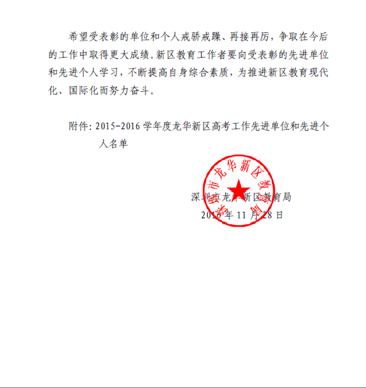2016年12月02日上午,龍華新區(qū)教育局召開龍華新區(qū)2016年中、高考工作總結(jié)大會,深圳市龍華中英文實驗學校獲得了“龍華新區(qū)2016年高考先進單位”榮譽稱號。